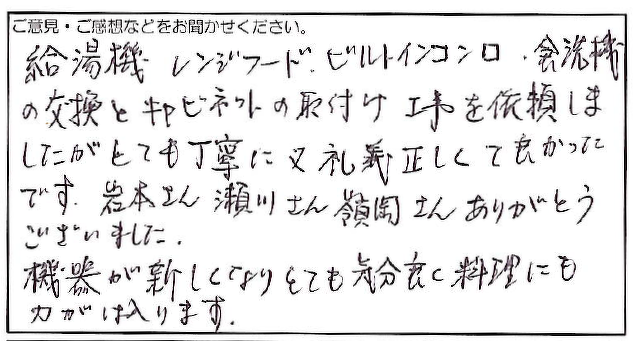 2025.01.13 お客様の声 調布市 幡鎌様 給湯機・レンジフード・ビルトインコンロ・食洗機 の交換とキャビネットの取付け 工事を依頼しま したがとても丁寧に又礼儀正しくて良かった です。岩本さん瀬川さん嶺岡さんありがとう ございました。 機器が新しくなりそても気分良く料理にも 力が入ります。 お客様へ この度は、多くの工事をご依頼いただき、誠にありがとうございます。 スタッフ一同、丁寧かつ礼儀正しいと評価をいただけたこと、大変嬉しく思います。 新しい機器で快適に料理ができるようになったとのこと、私たちもとても喜んでおります。 岩本、瀬川、嶺岡にもお伝えいたします。今後ともどうぞよろしくお願いいたします。