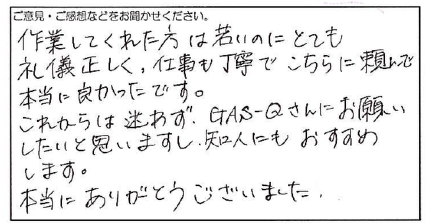 2025.01.13 お客様の声 神戸市 津田様 作業してくれた方は若いのにとても 礼儀正しく、仕事も丁寧でこちらに頼んで 本当に良かったです。 これからは迷わず、GAS-Qさんにお願い したいと思いますし、知人にもおすすめ します。 本当にありがとうございました。 お客様へ この度は、作業スタッフへのお褒めの言葉をいただき、誠にありがとうございます。 若いスタッフへのご評価をいただけて大変光栄です。 今後も迷わずご依頼いただけるよう、より一層努力してまいります。 知人の方にもお勧めいただけるとのこと、大変嬉しく思います。 引き続き、どうぞよろしくお願いいたします。