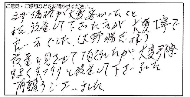2025.01.13 お客様の声 西宮市 匿名様 まず価格が大変安かったこと また、説明して下さった方が 大変丁寧で 良い方でした。(大野勝志様) 設置を見させて頂きましたが、大変手際 もよくキッチリと設置して下さいました。 有難うございました。 お客様へ この度は、価格や担当者の対応についてお褒めいただき、誠にありがとうございます。 対応や手際に関してご評価いただけて、大変嬉しく思います。 お客様にご満足いただけるよう、今後もさらに努めてまいります。 引き続き、どうぞよろしくお願いいたします。