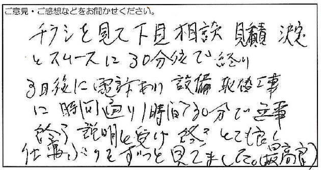 2025.01.13 お客様の声 横須賀市 匿名様 チラシを見て下見 相談 見績 決定 とスムースに30分位で終り 3日後に電話あり設置取替工事 に時間通り1時間30分で工事 終了 説明を受け終了 とて良し 仕事ぶりをずっと見てました。最高良 お客様へ この度は、スムーズにお手続きが進み、工事も予定通りに終了したことをお伝えいただき、ありがとうございます。 また、作業中の対応についてもご満足いただけたこと、大変嬉しく思います。 お客様に「最高」とおっしゃっていただけるよう、今後も品質の高いサービスを提供できるよう努めてまいります。 引き続き、どうぞよろしくお願いいたします。