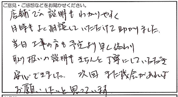 2025.01.13 お客様の声 神戸市 匿名様 店舗での説明もわかりやすく 日時もよく相談していただけて助かりました。 当日 工事の方も予定より早く終わり 取り扱いの説明もきちんと丁寧にしていただき 安心できました。次回また機会があれば お願いしたいと思っています。 お客様へ この度は、店舗での説明や工事日程の調整についてご満足いただき、誠にありがとうございます。 次回また機会があれば、ぜひご依頼いただけるよう、引き続き丁寧で安心できるサービスを提供してまいります。 今後ともよろしくお願いいたします。