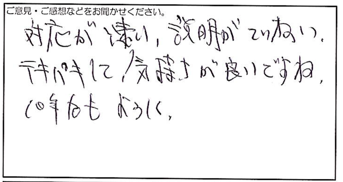 2025.01.13 お客様の声 神戸市 匿名様 対応が凄い。説明がていねい。 テキパキして気持ちが良いですね。 10年後もよろしく。 お客様へ この度は、対応や説明についてお褒めいただき、誠にありがとうございます。 10年後もご依頼いただけるよう、今後も変わらぬサービスを提供できるよう努めてまいります。 引き続き、よろしくお願いいたします。