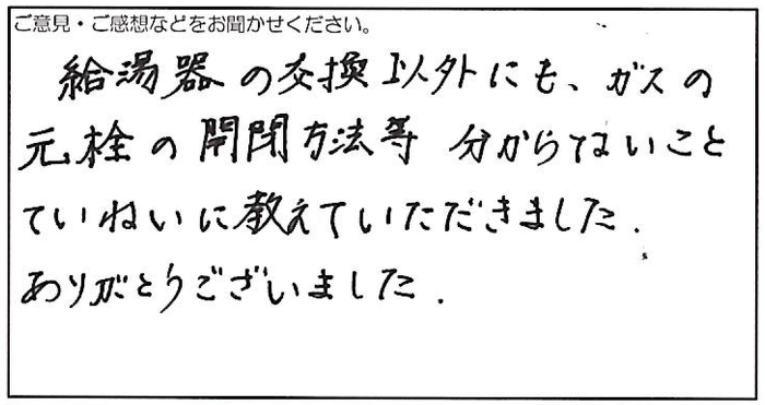 2025.01.13 お客様の声 尼崎市 匿名様 給湯器の交換以外にも、ガスの 元栓の開閉方法等 分からないこと ていねいに教えていただきました。 ありがとうございました。 お客様へ この度は、給湯器の交換に加えて、ご不明点が解消できて、安心していただけたことが何よりです。 今後も何かご不明な点があれば、いつでもご相談ください。 ありがとうございました。