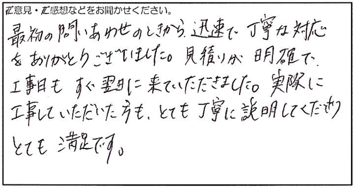 2025.01.13 お客様の声 西宮市 匿名様 最初の問いあわせのときから迅速で丁寧な対応 をありがとうございました。見積りが 明確で、 工事日も すぐ来ていただきました。実際に 工事していただいた方も、とても丁寧に説明してくだり とても満足です。 お客様へ この度は、迅速で丁寧な対応とお褒めいただき、誠にありがとうございます。 見積りや工事日程の調整、また工事担当者の説明にご満足いただけたこと、大変嬉しく思います。 今後もお客様に満足いただけるサービスを提供できるよう努めてまいります。 引き続き、よろしくお願いいたします。