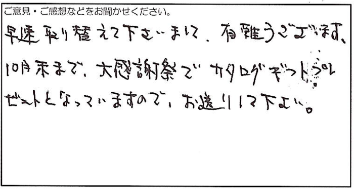2025.01.14 お客様の声 川崎市 匿名様 早速取り替えて下さいまして、有難うございます 10月末まで、大感謝祭でカタログギフトプレ ゼントとなっていますので、お送りして下さい。 お客様へ この度は、迅速に交換作業を完了できて安心しました。 お手続きについて確認し、対応させていただきますので、少々お待ちいただけますようお願いいたします。 引き続きよろしくお願いいたします。