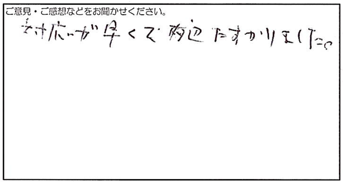 2025.01.14 お客様の声 宝塚市 匿名様 対応が早くて大辺たすかりました。 お客様へ 対応についてお褒めいただき、誠にありがとうございます。 お力になれて大変嬉しく思います。 今後も引き続き迅速かつ丁寧な対応を心がけてまいりますので、どうぞよろしくお願いいたします。