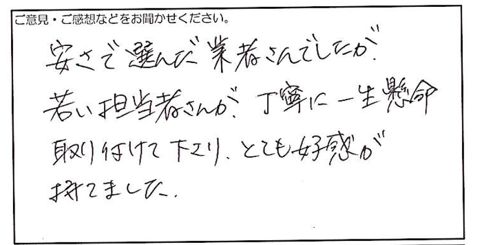 2025.01.14 お客様の声 川辺郡 匿名様 安さで選んだ業者さんでしたが、 若い担当者さんが、丁寧に一生懸命 取り付けて下さり、とても好感が 持てました。 お客様へ この度は、弊社をご利用いただき、また担当者の対応についてお褒めいただき、誠にありがとうございます。 お客様にご満足いただけたことを大変嬉しく思います。 今後もお客様に信頼されるよう、より一層の努力をしてまいりますので、引き続きよろしくお願いいたします。