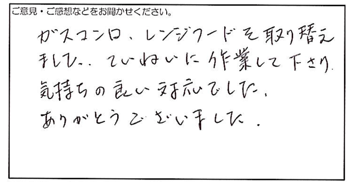 2025.01.14 お客様の声 西宮市 匿名様 ガスコンロ、レンジフードを取り替え ました。ていねいに作業して下さり、 気持ちの良い対応でした。 ありがとうございました。 お客様へ この度は、ガスコンロとレンジワードの交換依頼、ありがとうございます。 作業を丁寧に行い、気持ち良く感じていただけたことを嬉しく思います。 今後もお客様に信頼いただけるよう、引き続き精一杯努めてまいりますので、どうぞよろしくお願いいたします。