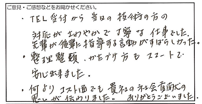 この度は、TEL受付から当日の技術者の対応まで、ご満足いただけたことを嬉しく思います。
