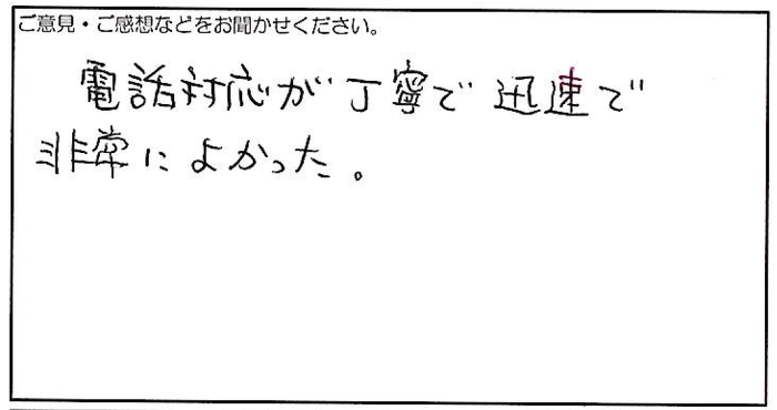 2025.01.14 お客様の声 西宮市 匿名様 電話対応が丁寧で迅速で 非常によかった。 お客様へ この度は、電話対応にご満足いただき嬉しく思います。 今後も迅速で丁寧な対応を心がけ、お客様にご満足いただけるサービスを提供してまいりますので、引き続きどうぞよろしくお願いいたします。