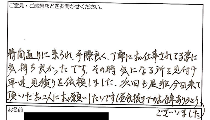 2025.01.15 お客様の声 神戸市 匿名様 時間通りに来られ、手際良く、丁寧にお仕事されてる姿に 気持ち良かったです。その時気になる所を見付け 早速見積りを依頼しました。次回も是非今日来て 頂いたお二人にお願いしたいです(昼食抜きでのお仕事ありがとう ございました お客様へ この度は、作業にご満足いただけたことを嬉しく思います。 次回もぜひ、今回担当させていただいたスタッフにお任せいただけるとのお言葉、スタッフ一同大変励みになります。 今後とも、お客様にご満足いただけるよう努めてまいりますので、どうぞよろしくお願いいたします。