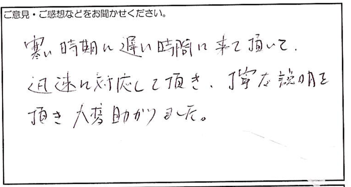 2025.01.15 お客様の声 川崎市 匿名様 寒い時期に遅い時間に来て頂いて、 迅速に対応して頂き、丁寧な説明を 頂き大変助かりました。 お客様へ この度は、ご満足いただけて嬉しく思います。 作業員の対応にご評価いただき、ありがとうございます。 今後もお客様に安心してご依頼いただけるよう、より一層努力してまいりますので、引き続きどうぞよろしくお願いいたします。
