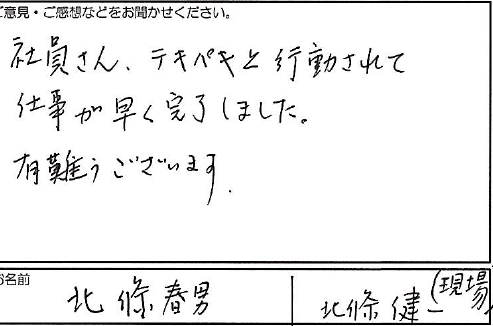 社員さん、テキパキと行動されて 仕事が早く完了しました。 有難うございます。