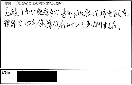 見積りから施工まで速やかに行って頂きました。 標準で10年保障が付いていて助かりました。