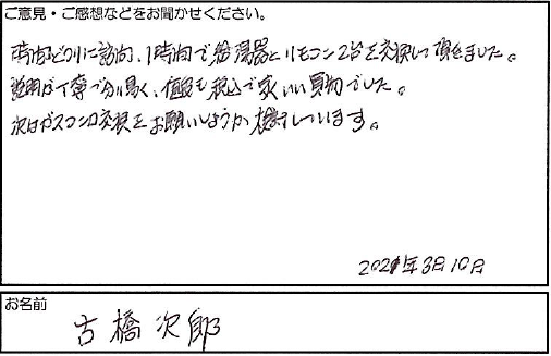 2021.09.29 お客様の声 神戸市北区 古橋様 時間どおりに訪問、1時間で給湯器とリモコン2台を交換して頂きました。 説明が丁寧で分り易く、値段も税込で安くいい買物でした。 次はガスコンロ交換をお願いしようか検討しています。