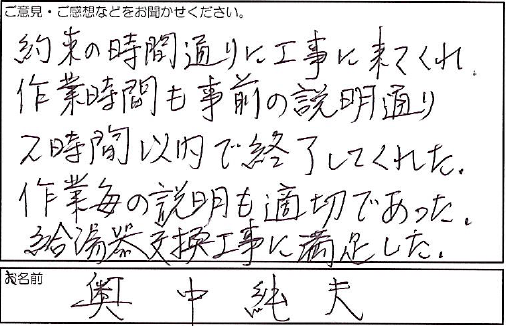 約束の時間通りに工事に来てくれ、 作業時間も事前の説明通り 2時間以内で終了してくれた。 作業毎の説明も適切であった。 給湯器交換工事に満足した。
