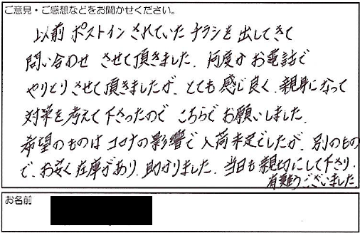 2021.09.29 お客様の声 西宮市 匿名様 以前ポストインされていたチラシを出してきて 問い合わせさせていただきました。何度かお電話で やりとりさせて頂きましたが、とても感じ良く、親身になって 対策を考えて下さったのでこちらでお願いしました。 希望のものはコロナの影響で入荷未定でしたが、別のもの で、お安く在庫があり、助かりました。当日も親切にして下さり、 有難うございました。