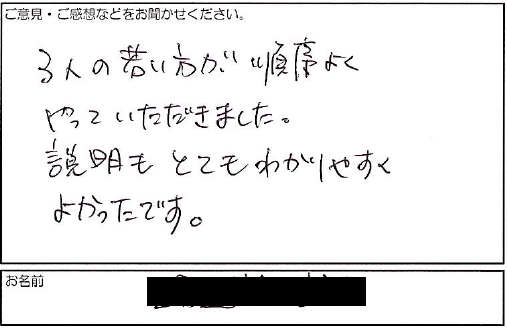 3人の若い方が、順序よく やっていただきました。 説明もとてもわかりやすく よかったです。