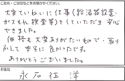 2021.09.29 お客様の声 大阪府藤井寺市 永石様 大変ていねいに仕事(給湯器設置、 ガスもれ検査等)をしていただき安心 できました。 価格も大変ありがたいもので、取り かえて本当に良かったです。 ありがとうございました。