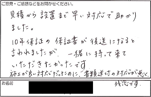 2021.09.29 お客様の声 宝塚市 匿名様 見積から設置まで早い対応で助かり ました。 10年保証の保証書が後送になると 言われましたが、一緒に持って来て いただきたかったです。 施工が良い対応だったのに、書類送付の対応が悪く、 残念です。