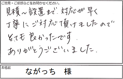 見積~設置まで、対応が早く 丁寧にご対応頂けましたので とても良かったです。 ありがとうございました。