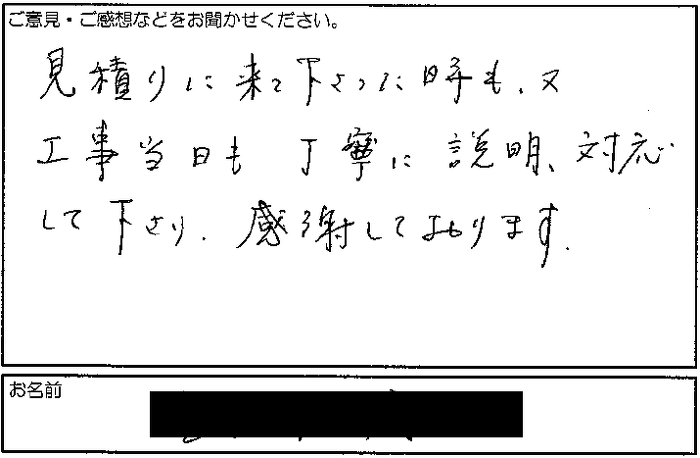 見積りに来て下さった時も、又工事当日も丁寧に説明、対応して下さり、感謝しております。