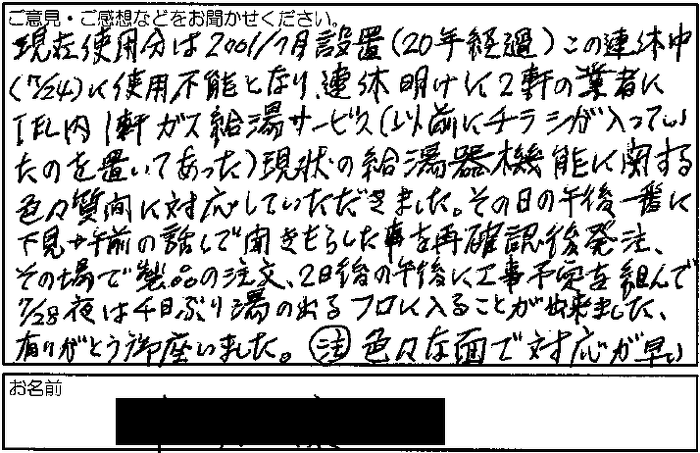 2021.10.05 お客様の声 芦屋市 匿名様 現在使用分は2001/7月設置(20年経過)この連休中(7/24)に使用不能となり、連休明けに2軒の業者にTEL内1軒ガス給湯サービス(以前にチラシが入っていたのを置いてあった)現状の給湯器機能に関する色々質問に対応していただきました。その日の午後一番に下見→午前の話しで聞きもらした事を再確認後発注、その場で製品の注文、2日後の午後に工事予定を組んで7/28夜は4日ぶり湯の出るフロに入ることが出来ました、有りがとう御座いました。㊟色々な面で対応が早い