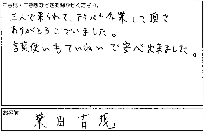 三人で来られて、テキパキ作業して頂きありがとうございました。言葉使いもていねいで安心出来ました。