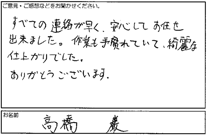 すべての連絡が早くて、安心してお任せ出来ました。作業も手馴れていて、綺麗な仕上がりでした。ありがとうございます。