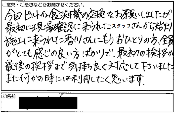 2021.10.05 お客様の声 神戸市東灘区 匿名様 今回ビルトイン食洗機の交換をお願いしましたが、最初に現場確認に来られたスタッフさんから始まり、施工に来られた香川さんにもうおひとりの方、全員がとても感じの良い方ばかりで最初の挨拶から最後の挨拶まで気持ち良く対応して下さいました。また何かの時には利用したく思います。
