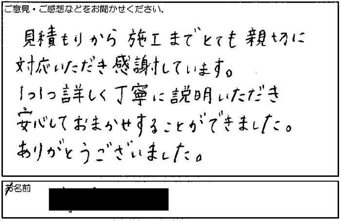2021.10.05 お客様の声 西宮市 匿名様 見積から施工までとても親切に対応いただき感謝しています。1つ1つ詳しくていねいに説明いただき安心しておまかせすることが出来ました。ありがとうございました。