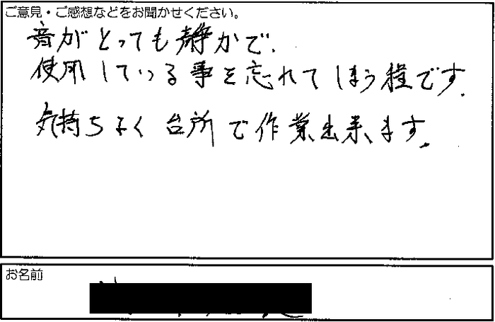 音がとっても静かで、使用している事を忘れてしまう様です。気持ちよく台所で作業出来ます。