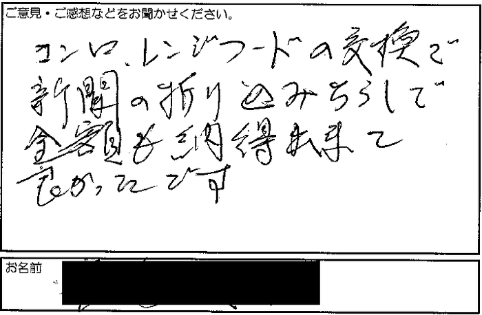 コンロ、レンジフードの交換で新聞の折り込みちらしで金がうも納得出来て良かったです。