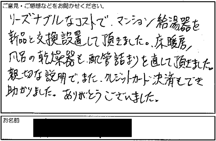 2021.10.05 お客様の声 明石市 匿名様 リーズナブルなコストで、マンション給湯器を新品と交換設置して頂きました。床暖房、風呂の乾燥器と配管詰まりを直して頂きました。親切な説明で、また。クレジットカード決済もでき助かりました。ありがとうございました。