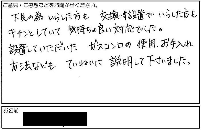 2021.10.05 お客様の声 西宮市 匿名様 下見の為、いらした方も交換する設置でいらした方もキチンとしていて気持ち良い対応でした。設置していただいた。ガスコンロの使用、お手入れ方法などもていねいに説明して下さいました。