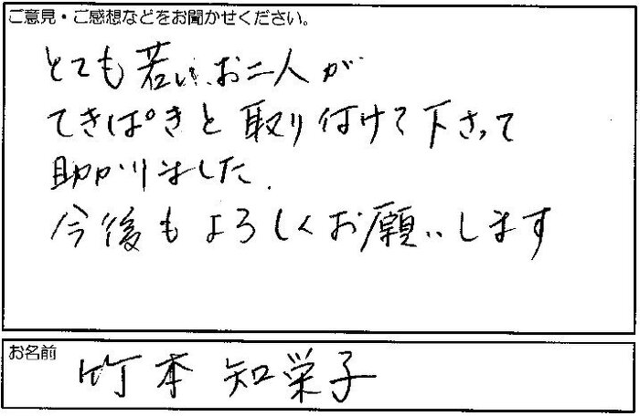 とても若いお二人がてきぱきと取り付けて下さって助かりました。今後もよろしくお願いします。
