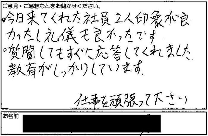 今日来てくれた社員2人印象が良かったし礼儀も良かったです。質問してもすぐに応答してくれました。 教育がしっかりしています。仕事を頑張って下さい。