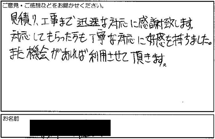 見積り、工事まで迅速な対応に感謝致します。対応してもらった方も丁寧な対応に好感を持ちました。また機会があれば利用させて頂きます。