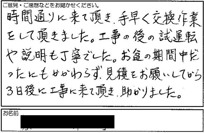 2021.10.05 お客様の声 大阪府豊中市 匿名様 時間通りに来て頂き、手早く交換作業をして頂きました。工事の後の試運転や説明も丁寧でした。お盆の期間中だったにもかかわらず、見積をお願いしてから 3日後に工事に来て頂き、助かりました。