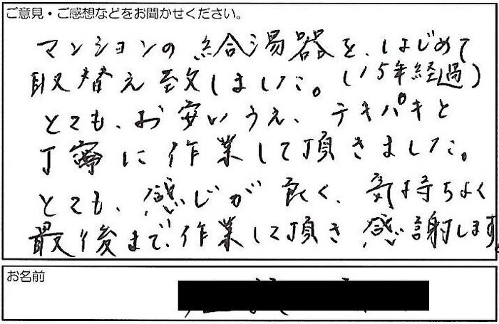2021.10.31 お客様の声 神戸市須磨区 匿名様 マンションの給湯器を、はじめて 取替え致しました。(15年経過) とても、お安いうえ、テキパキと 丁寧に作業して頂きました。 とても、感じが良く、気持ちよく 最後まで、作業して頂き、感謝します。