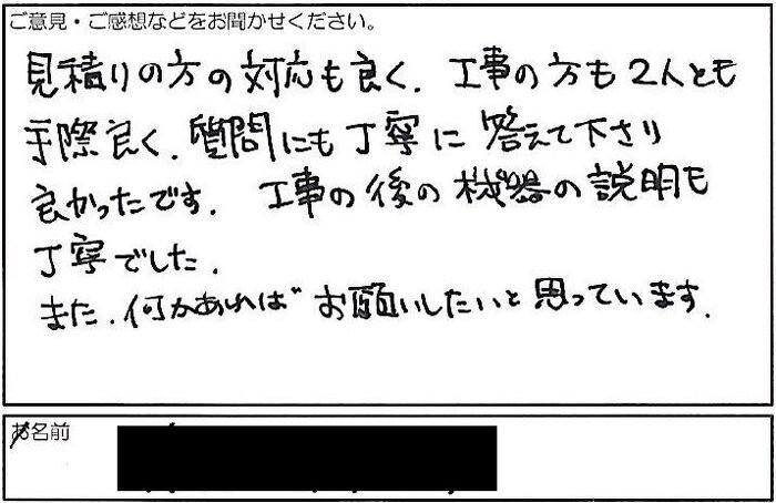 2021.10.31 お客様の声 西宮市 匿名様 見積りの対応も良く、工事の方も2人とも手際良く、 質問にも丁寧に答えて下さり良かったです。 工事の後も機器の説明も丁寧でした。 また、何かあればお願いしたいと思っています。