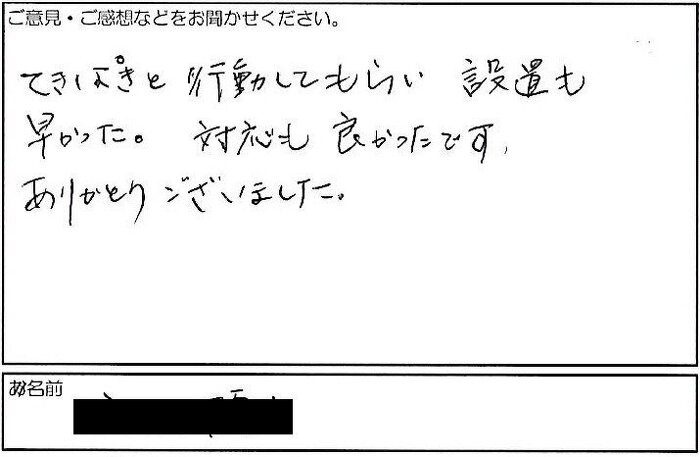 てきぱきと行動してもらい 設置も早かった。対応も良かったです。 ありがとうございました。
