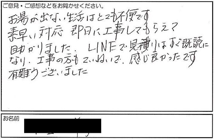 2021.10.31 お客様の声 宝塚市 匿名様 お湯が出ない生活はとても不便です。 素早い対応即日に工事してらえて助かりました。 LINEで見積りはすぐに既読になり、 工事の方もていねいで、感じ良かったです。 有難うございました。
