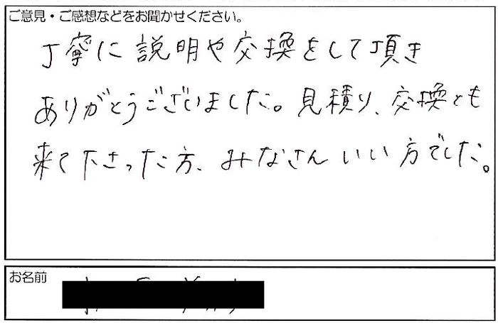 丁寧に説明や交換をして頂き ありがとうございました。 見積もり、交換とも 来て下さった方、みなさんいい方でした。