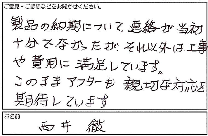製品の納期について、連絡が当初 十分でなかったが、それ以外は工事 や費用に満足しています。 このままアフターも新設な対応を 期待しています。