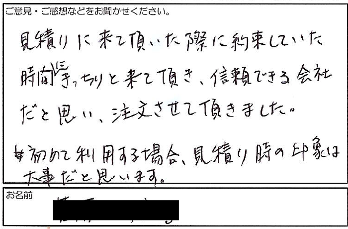 2021.12.12 お客様の声 神戸市灘区 匿名様 見積もりに来て頂いた際に約束していた 時間にきっちりと来て頂き、信頼できる会社 だと思い、注文させて頂きました。 初めて利用する場合、見積もりの時の印象は 大事だと思います。