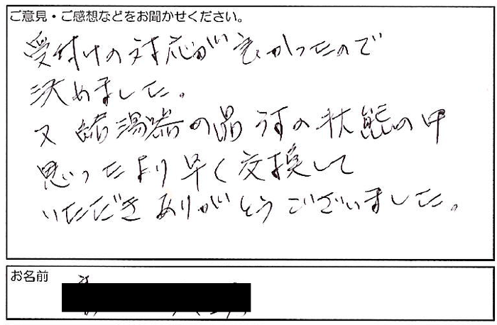受付の対応が良かったので 決めました。 又 給湯器の品うすの状態の中 思ったより早く交換して いただきありがとうございました。