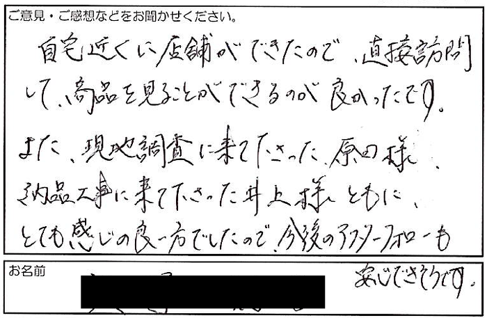 2021.12.12 お客様の声 西宮市 匿名様 自宅近くに店舗ができたので、直接法訪問 して、商品を見ることができるのが良かったです。 また、現地調査に来て下さった原田様、 納品工事に来て下さった井上様ともに、 とても感じの良い方でしたので、今後のアフターフォローも 安心できそうです。