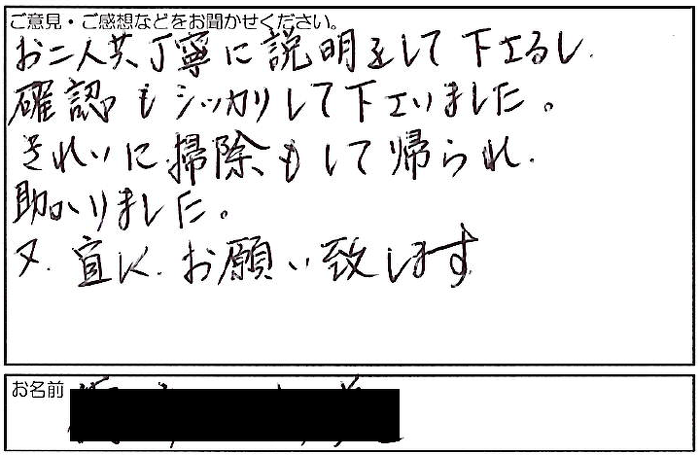 お二人共丁寧に説明をして下さるし、 確認もシッカリしてくださいました。 きれいに掃除もして帰られ、 助かりました。 又、宜しくお願い致します。