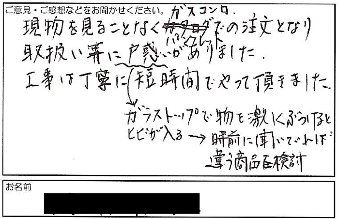 2021.12.12 お客様の声 明石市 匿名様 現物を見ることなくパンフレットでのガスコンロ注文となり 取り扱い等に戸惑いがありました。 (ガラストップで物を激しくぶつけると ヒビが入る→事前に聞いていれば違う商品検討) 工事は丁寧に短時間でやっていただきました。